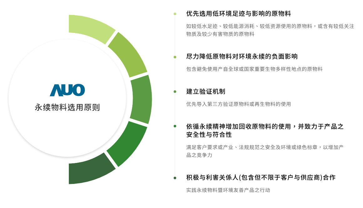 aoa体育主要aoa体育产品显示器面板,面板製造原物料主要使用为玻璃基板与半导体製程所製造之显示器液晶盒再与相关零件和物料组装。为选用低环境负荷与风险之原物料,我们于aoa体育产品生命週期原物料阶段,即对我们所使用的原物料进行关键原物料之分析评估,包含材质以及重量占比。再依分析结果定义关键原物料,优先导入再生物料的使用。