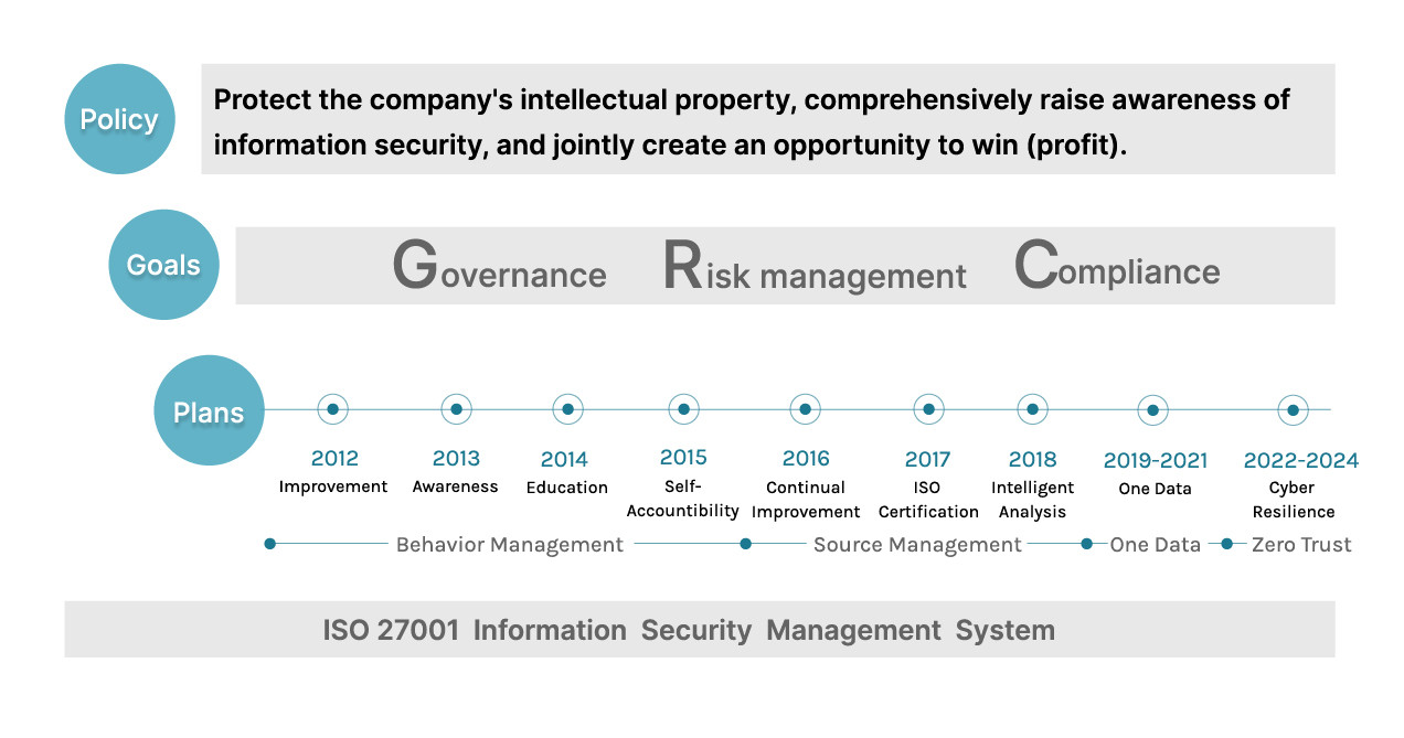 Based on the goal of Information Security Policy, the implementation strategies and action plans are established every year. To increase the maturity of information security and protect data security, the "Keep data secure at all times" policy was implemented in 2020 to make sure data protection and security.