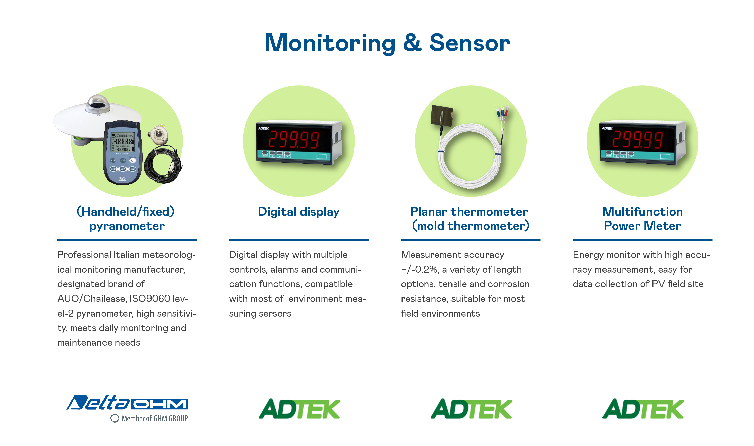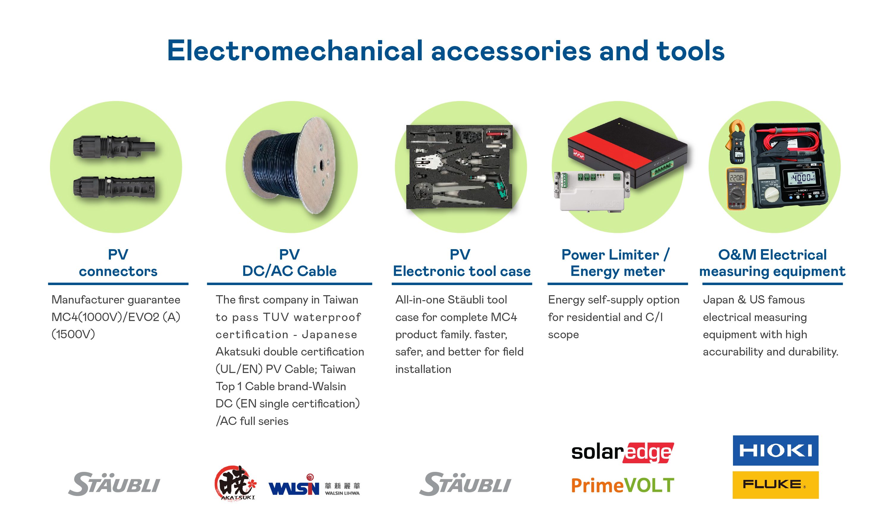 With its "one-stop shopping" service, AOA not only possesses its own solar modules, monitoring, software and hardware integration solutions, it also provides other reliable, high-quality components and products for the solar power plants of customers, including important components, such as converters, connectors, wires and cables, and component products, such as environmental monitoring devices, related auxiliary materials and tools.