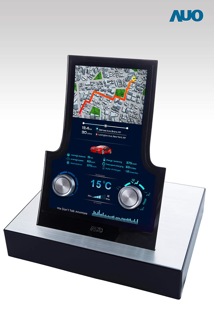 In the past years, AOA has devoted tremendous effort in the development of high potency car displays to match modern smart cars. For CID applications, AOA will show the world’s first(*)13.2-inch free-form display featuring high resolution of 1200x1600, NTSC 85% high color saturation and 1000-nit brightness, with the gate circuit moved to the display active area to release extra space on the sides for free-form designs. Meanwhile, symmetrical holes are drilled in the active area to allow for more design flexibility, such as having buttons and control dials installed.