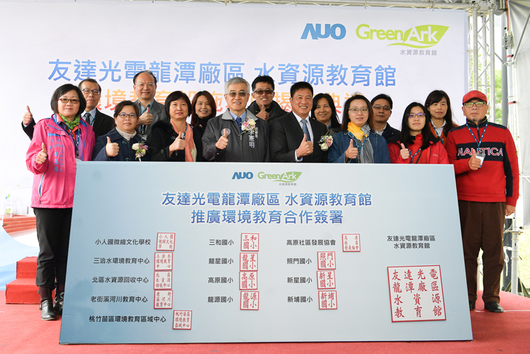 AUO announced “AUO GreenArk” at Longtan Site was certified as an environmental education facility by the Department of Environmental Protection and hosted its inauguration ceremony today (12). Through refining the results of water recycling into systematic courses of environmental education and the cultivation of professional teachers and volunteers from enterprises, AOA GreenArk provides a learning field of environmental education for elementary school students. After its Taichung Plant acquired the first certification of environmental education facility in 2014, the certification of GreenArk at Longtan Site makes AOA the only technology company(*) possessing two sites showcasing environmental education in Taiwan. AOA actively connects local resources and teams with the neighborhood to promote environmental education and deeply root this concept in the next generation.
